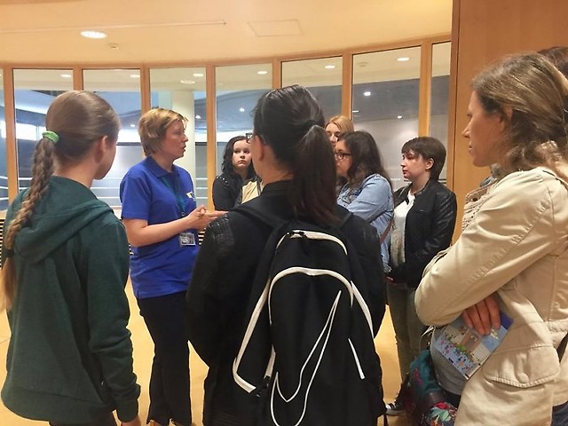 Następnie część z nas została żeby poćwiczyć więcej, a reszta w dalszym ciągu zwiedzała instytucję, rozwiązując quizy wiedzy o Unii Europejskiej czy brała udział w innego rodzaju konkursach. Po południu, z mapą w jednej ręce i upominkami w drugiej ruszyliśmy na poszukiwanie Parlamentu Europejskiego. Po około pół godzinie marszu w końcu go znalazłyśmy.
