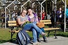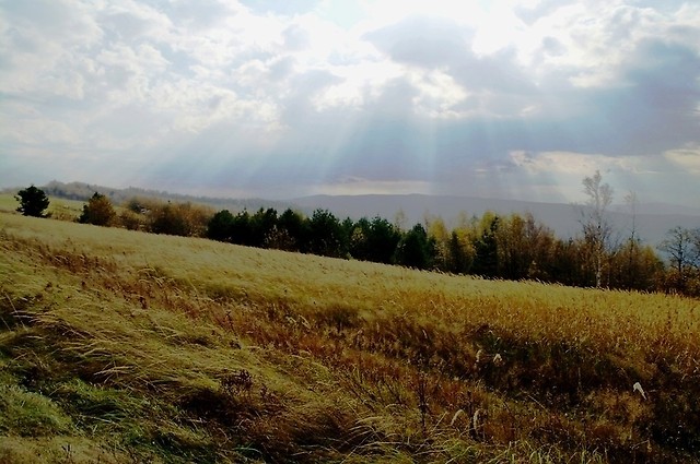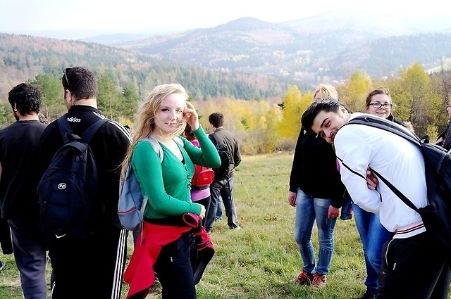 Szybko dotarliśmy na granicę iwonickiego lasu, zaś kolejnym odcinkiem trasy była beskidzka połonina. Środkowa część grzbietu górskiego, po którym stąpaliśmy, to Przymiarki. Tam dwoje fotografów ‘wyrządziło’ grupie kilka zdjęć. Był to nie lada wyczyn, zmieścić w kadrze tyle twarzy i nie pominąwszy przy tym tła. Właśnie. Tło. Dokoła roztaczały się malownicze widoki, ‘patrząc z góry wokoło, świat wydawał się lepszy’ (KSU). Po chwili wytchnienia, oczarowani pięknem jesiennej przyrody, ruszyliśmy dalej. Można by nawet rzec, że byliśmy ‘gnani wiatrem’, bo naszej wędrówce towarzyszyły silne porywy ‘halnego’. W Rymanowie Zdroju zarządzono krótką przerwę. To odpowiedni czas na opróżnienie jadalnych zasobów plecaków, czy też skorzystanie z rozmaitych atrakcji uzdrowiska. Mogliśmy chociażby zrobić zdjęcie z żabą rezydującą obok Pijalni Wód Mineralnych, nakarmić kaczki albo obejrzeć wystawę fotografii lokalnych krajobrazów. ‘Przybyłem, zobaczyłem...’ i poszedłem dalej. Dalej, czyli do Wołtuszowej. Tam czekały na nas inne grupy studenckie. Wrzuciliśmy co nieco ‘na ruszt’ i skorzystaliśmy też z uprzejmości pana, który serwował herbatę, a serwował ją po polsku, hiszpańsku i turecku. W każdym z tych serwisów radził sobie bardzo dobrze :-). Następnie chętni mogli zająć się ‘odbijaniem piłeczki’ na okolicznej łące, albo rozmową z towarzyszami wyprawy. Inni zaś zajęli miejsca leżące i nastawili swoje twarze na pochłanianie promieni UV. Około godziny 15 wróciliśmy do Rymanowa, gdzie czekali już na nas kierowcy autokarów.